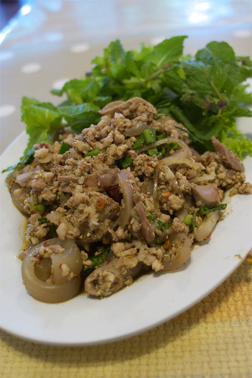 豚ひきのラープですが、米の煎ったやつが食感のバランスを崩しており、