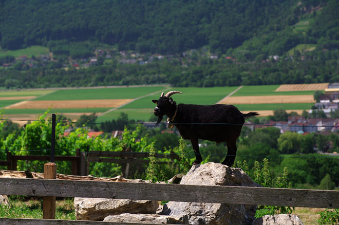 マイエンフェルトを眼下に。 白いのは牧草を貯蔵しておくためのもののようです。
