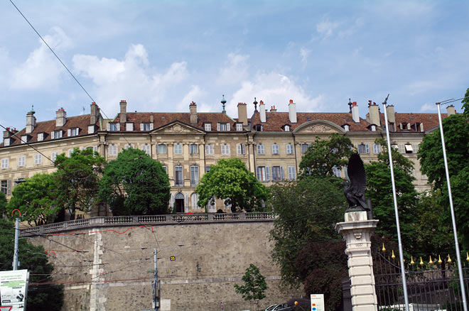 ジュネーヴを本拠地として活動したカルヴァンの生誕400年を記念して1917年に完成した記念碑。カルヴァンをはじめとする4人の宗教改革家の像が刻まれている。