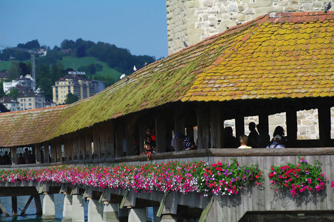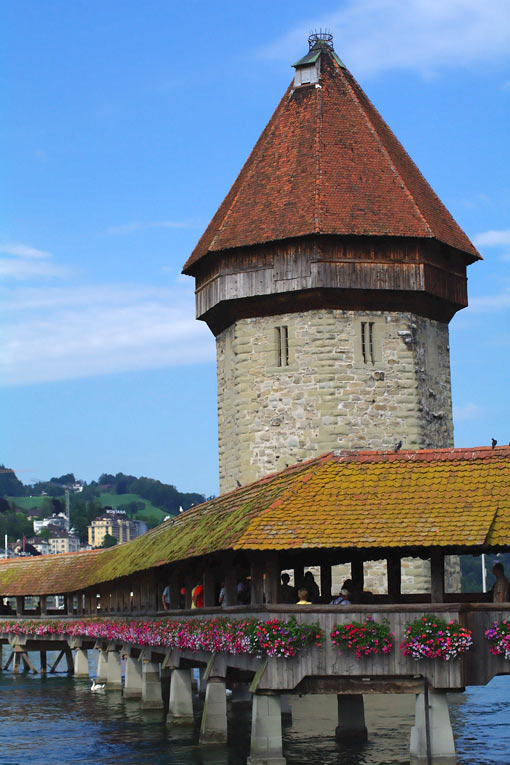 町の要塞のために1333年に作られた屋根付き橋で、内部には17世紀にはルツェルンの歴史が書かれた絵が並んでおります。