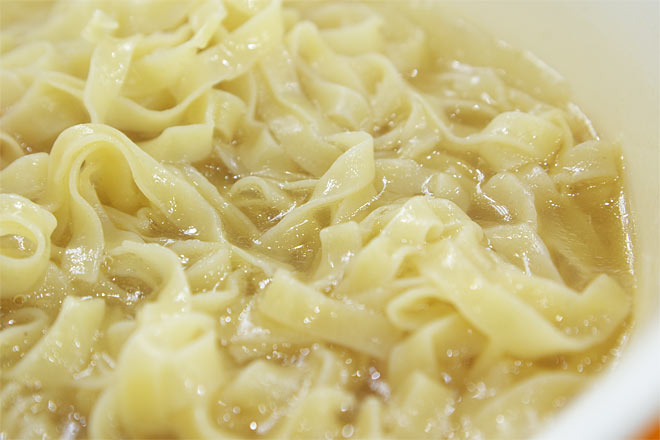 麺は固く平たいインスタントな麺。 白菜にはしっかり火が通って、甘くなっております。