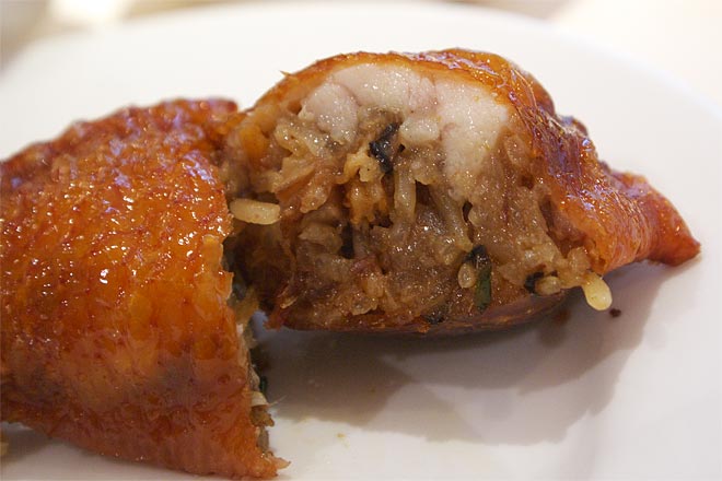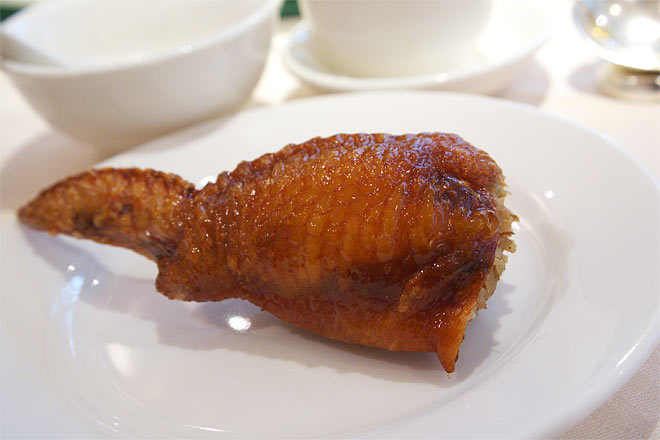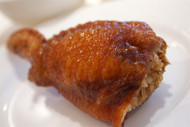 手羽の中にむっちりともち米が詰まっている。 ナイフとフォークで頂きますが、ナイフをいれると皮はパリッと音がします。