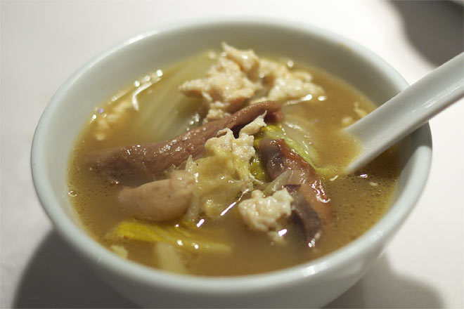 白菜が煮込まれて甘い味わい。 どことなくみそ汁テイストな感じが郷愁をそそる。