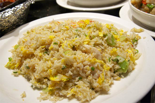 えび、白身の魚、ねぎ、卵などが入ったお店の名を冠した炒飯。