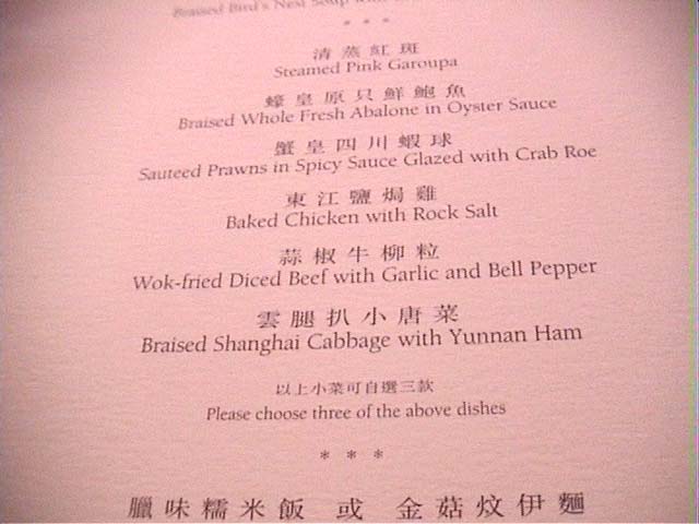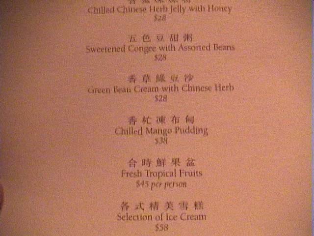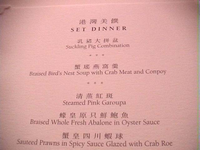 総評まだまだ未熟でした。 こんな素晴らしいレストランがあるなんて。 前々回、食べた「文華」とは異なる感動が・・・・・「文華」は、 そうあまり中華っぽくない感じがするのですが、こちらはモロ中華の味わい。 それにしても、午前中食べたその辺の中華となぜこんなにも違うのだろう? 素材? 調理法? 上湯? 不思議です。 つい、明後日の夜の予約をいれてしまいました。。 いかん、行けるレストランが1軒減ってしまった;; これがコースじゃなくてアラカルトだったら、どうなるの?? って感じです。 そして、グランドメニューを見ましたが、アワビやフカヒレなどの高級素材を除けば 普通に一品2000円〜3000円前後。 日本の中華に比べたら激安です。 店の客層もかなりカジュアルで、ネクタイ締めているのって私だけ? って感じでした。 フロアは一部吹き抜けの2階構造になっており、席数はかなり多めです。 サービスも悪くはないです。ただ、サービスする方の人数もそれなりにいるようですが、 席数が多いため細かい所までは行き届かないようです。料理も途中で止まってしまいました。 急いでいる訳ではないので、のんびりと待っていましたがちょっと気になりました。 そうは言っても店員の英語も聞き取り安く、非常に楽しく、美味しく過ごせた1軒でした。 途中で胃の調子が悪く、気持ち悪くなってしまったので、コメントが後半辛目ですが・・・・ |