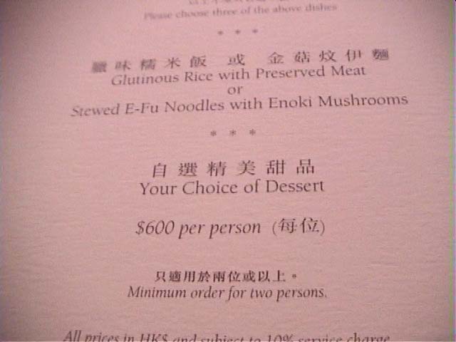 入店話しに聞く限り絶賛される中華料理店である。香港4度目にしてようやく実現したこのお店への訪問。 日本国内から窓側の席をしつこいほどまでに予約して。。。 ホテルの8Fにあり、眺めがよいとされるが、果たしてどうであろうか? 窓際をゲットするために予約より15分ほど早めに入店し、席まで案内される。 そこは・・・・・・・・ パラダイス であった ^^); ![]() 窓の外からは夕日の赤が店内を照らし、さながら夕焼けで店内が染まったかのような風景。 そして窓の外には同じく、夕焼けに照らされた海が眼下に広がる・・・・・ う〜ん、確かに素晴らしい。 店員はフレンドリーとは言えないが、聞き易い英語で非常にありがたい。 メニューは日本語のコースが3つ、英語で書かれたコースが1つ、 あとはグランドメニューと季節のおすすめメニューが目の前に広がる。 食前酒のビールをたしなみながら、ゆっくりとメニューをセレクトする。 結局、英語の記述によるコースをセレクト。 (日本語だとなんかぼられている気がする・・・詳しく計算してませんが) 640HK$のコースでまずは様子見を。 よければ、再度挑戦します。 これぞ長期戦の余裕。。 このコースは、前菜、スープの後、5種類の中から3種を選ぶようなコースになっている。 メニュー1、 メニュー2、 メニュー3、 メニュー4 ![]() 注文