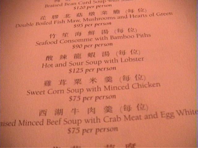 コーン、卵白、鶏のミンチからなるトロリとしたスープ。塩分は強く感じる。