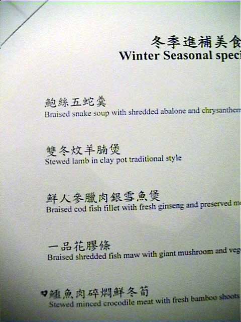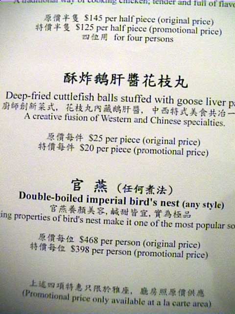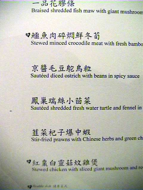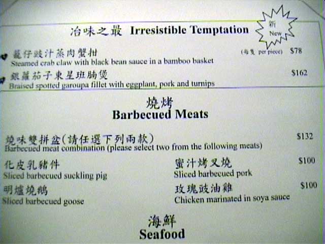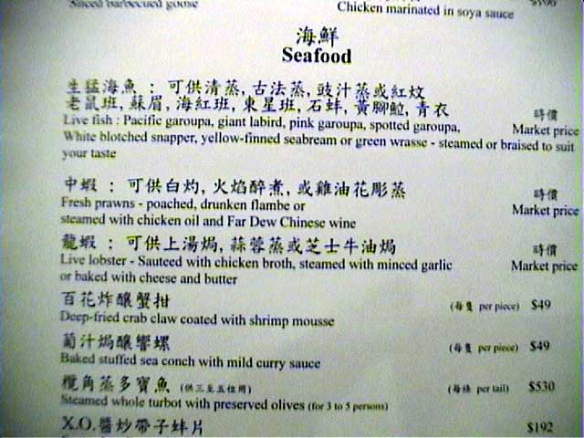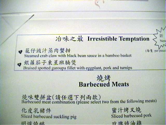 入店今年も買いました限定のレストランガイド(外人向け)2002年度版。 昨年、今年と意外にいい点数がついているこちらのお店。一体どんなものか 興味あり、挑戦。お昼に。 ![]() 前日に席のみ予約しておき、当日訪れてみる。 かなりローカル系。 案内嬢は片言の日本語を操れるが、それ以外はもろローカル系のサービス。 勝手にジャスミン茶をもってくるな、ボケ。 許すまじ。 など目の前で日本語で言ってみたりして。。困ったものだ。 このジャスミン茶はあまり良い物ではないようだ。 花も混じり、人工的な香りが強すぎて料理に合わない。ああ、普通は聞かれるのに・・・・ ![]() また、突き出しがでたのであるが、これを食べて、う〜ん、今ひとつ。 この店はやばいかも、という不安がよぎる。 (ただ、香港の場合、突き出し(アミューズ)が今一つでも料理はOKな事が多いのですが) グランドメニューをもらい、リコメンドなメニューから数品をセレクション。 メニュー例です。 メニュー1、 メニュー2、 メニュー3、 メニュー4、 メニュー5、 メニュー6 なお、メニューからローカル向けといわれているメニューを選ぶと何か「ぶつぶつ」言っているし (ローカル向けだがいいか? と聞いているようで、OKと返答した)・・・ 何か問題があるか? と聞くと、肩をすくめるような仕草。 腹の立つ対応である。 ちなみにこのホテルはインターコンチ(系列)である。 また、ガラス張りの厨房で調理しているのが見えるのがなかなか面白い。 ![]() 注文![]()