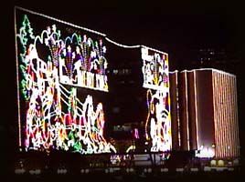 沢山のホテルやビルの壁一面に様々なイルミネーションが飾られています。